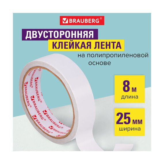 Двухсторонняя клейкая лента BRAUBERG на основе полипропилена используется для склеивания гладких поверхностей при проведении оформительских, монтажных и отделочных работ.