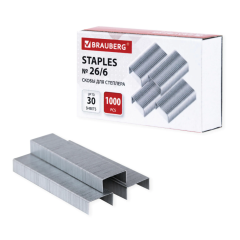 Стальные скобы серебристого цвета для степлера BRAUBERG размером № 26/6. Прочные скобы для степлера имеют цинковое покрытие, которое защищает их от коррозии. Являются более экономичным вариантом при сохранении стандартной для скоб № 24/6 пробивной способности. Максимальное количество сшиваемых листов - 30 штук. Продаются в картонной упаковке по 1000 штук в каждой, что является оптимальным вариантом для долговременного использования.