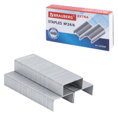 Скобы для степлера BRAUBERG "EXTRA" размером №24/6 обеспечивают сшивание до 30 листов. Цинковое покрытие защищает от коррозии. Выполнены из стали серебристого цвета. 1000 штук в картонной коробке хватит на долгое время. Используемые при производстве улучшенные материалы и специальная конструкция ножки облегчают сшивание бумаги в сравнении с обычными скобами.