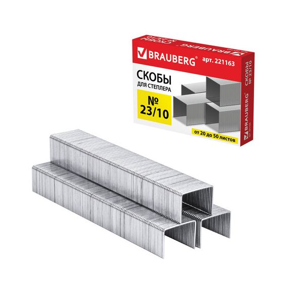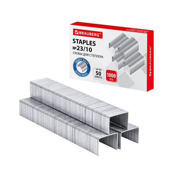 Заточенные стальные скобы серебристого цвета для степлера BRAUBERG размером № 23/10.