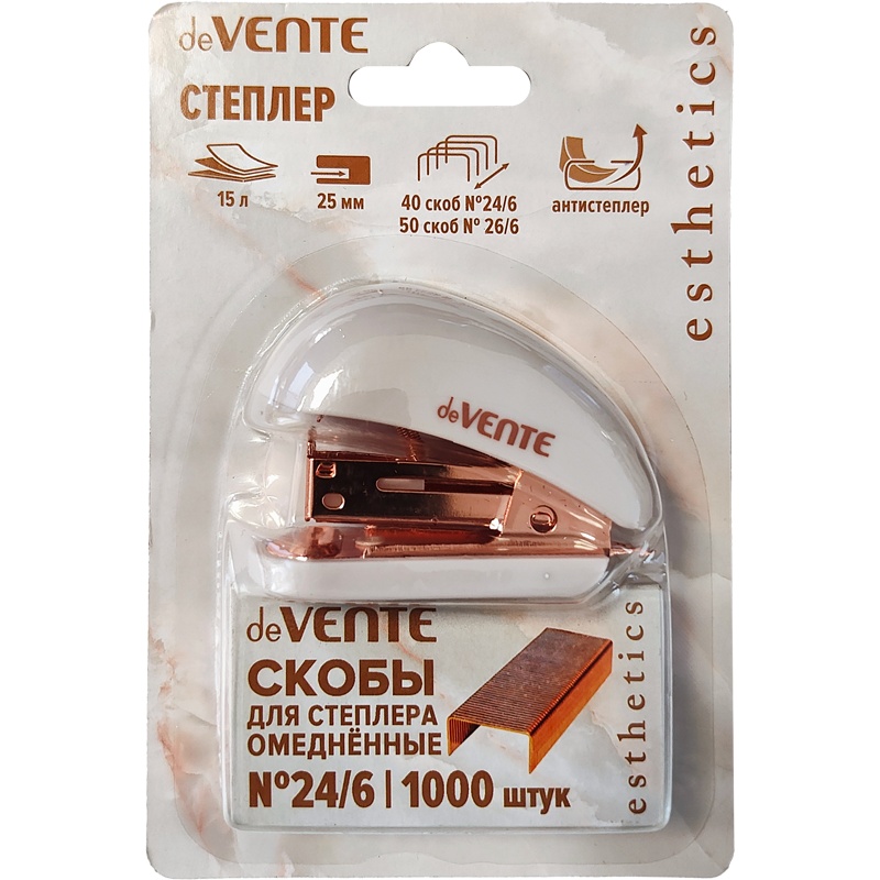 Степлер МИНИ "deVENTE. Esthetics" 24/6&26/6 (мощность 15 листов, глубина скрепления 25 мм) пластиковый, c покрытием Velvet Touch, со встроенным антистеплером, в блистерной упаковке, цвет лавандово-пепельный, металлические детали цвета розового золота, в наборе с омеднёнными скобами 1000шт.