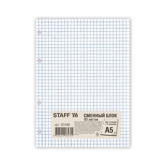 Сменный блок STAFF предназначен для письма гелевыми, шариковыми, капиллярными и перьевыми ручками. Универсальная перфорация на 4 отверстия.