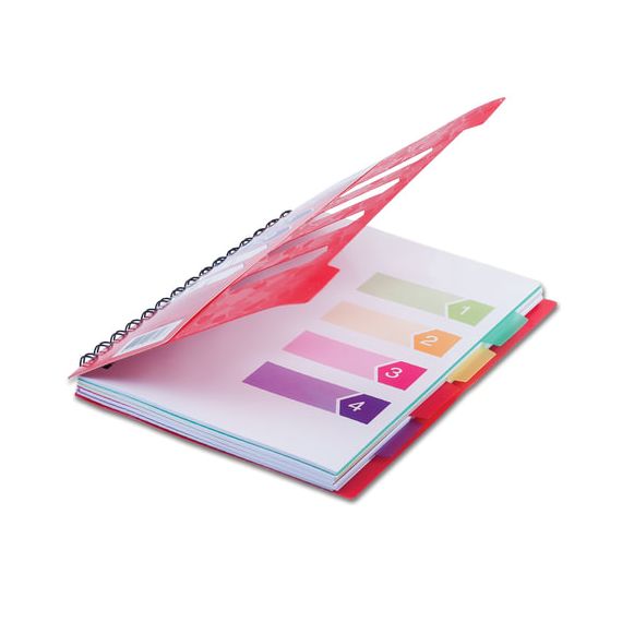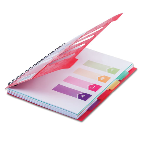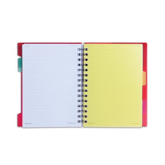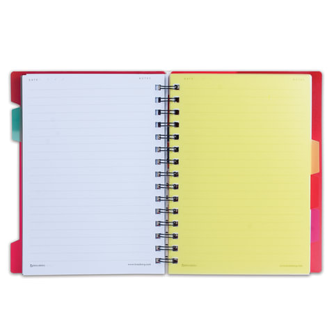 Пластиковая обложка надежно защитит внутренний блок от повреждений. Внутренний блок содержит 120 листов офсетной бумаги плотностью 65 г/м2 и белизной 100%. Линовка блока - в линию. Тетрадь снабжена четырьмя пластиковыми, съемными разделителями. Листы соединены евроспиралью. Формат А5.