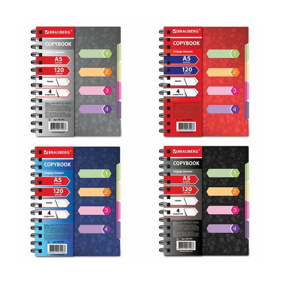 Тетрадь-блокнот 120 л., A5, 170x215 мм, BRAUBERG, линия, гребень, обложка пластиковая, 4 разделителя