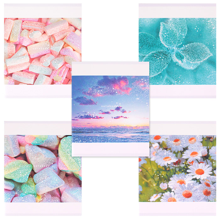 Тетради А5 96л. Скрепка. Клетка. Обл.: мел. картон, выб. лак, блестки "Перламутр". Бум. оф.60 г/м2. Нежность, Россия