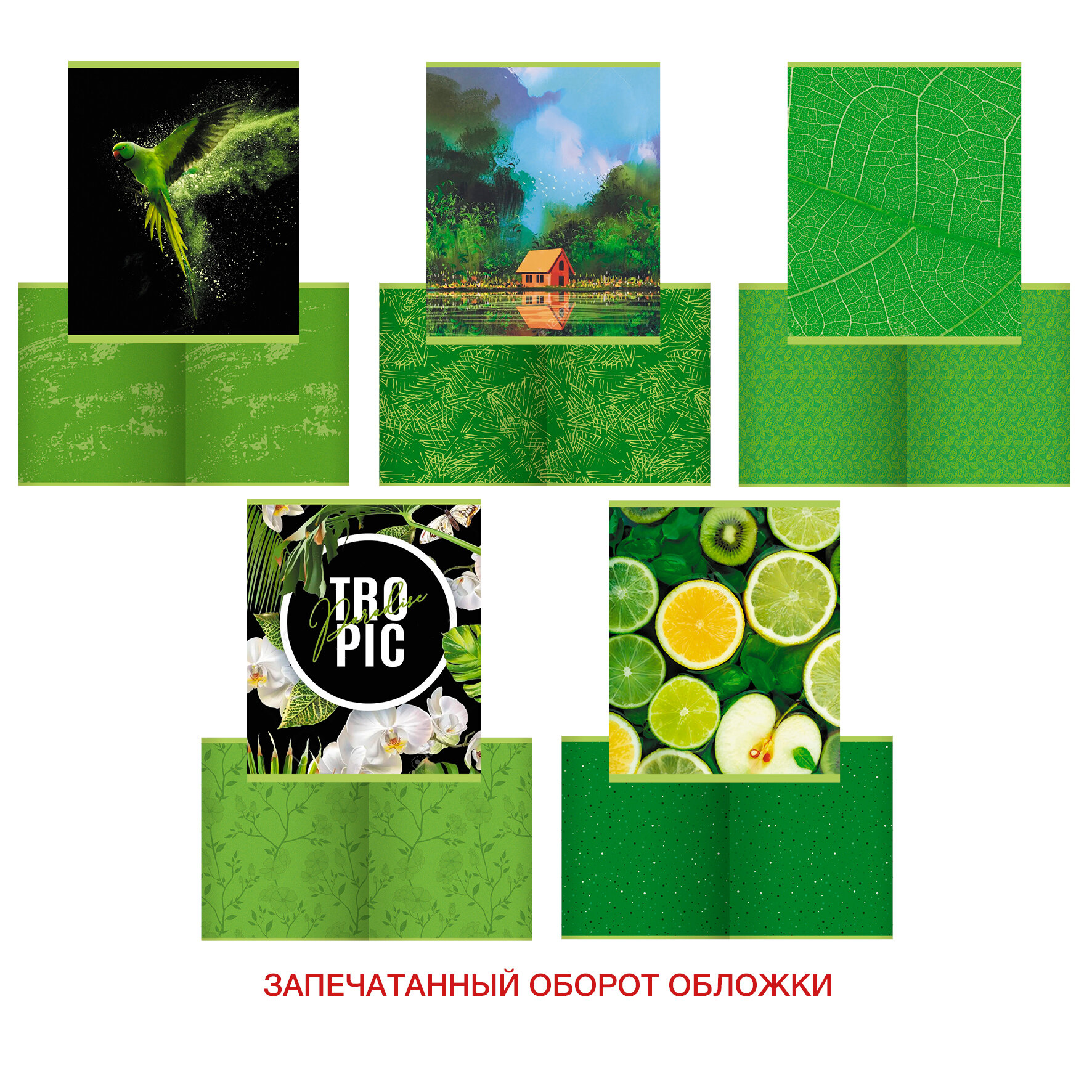 Тетради А5 48л. Скрепка. Клетка. Обложка: мелованный картон, матовая ламинация. Бумага цветной тонированный офсет 60г/м2. Green mix