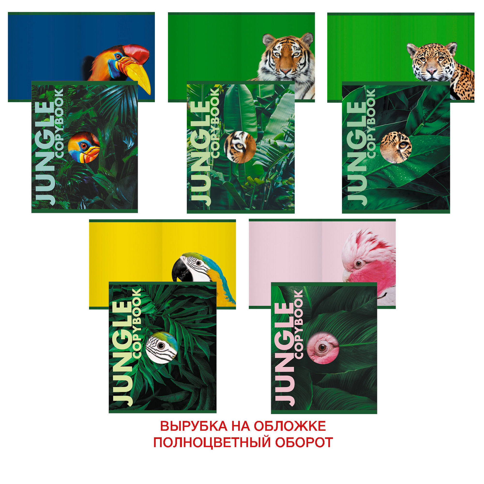 Тетради А5 48л. Двойная обложка. Скрепка. Клетка. Первая обл.: мел.картон с вырубкой, мат. вд-лак. Вторая обл.: мел.бумага, полноцветная печать. 60г/м. Jungle