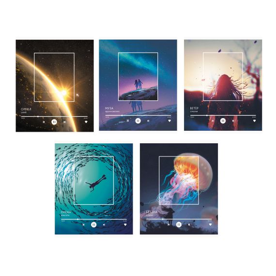 Тетради А5 48л. Скрепка. Клетка. Обложка: мелованный картон, глиттерный лак с блестками. Бумага: белый офсет 60г/м2. Плейлист