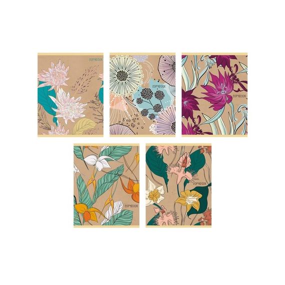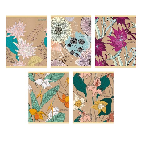 Тетради А5 48л. Скрепка. Клетка. Обл.: мел. картон, выб. лак. Бум. оф.60 г/м2. Поля. В уп. 5 видов. Уп./гофр. по 10 шт. в терм. пл. Графичные цветы