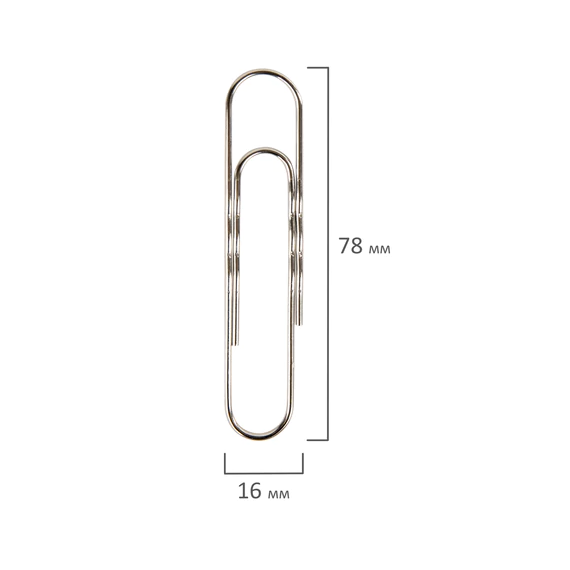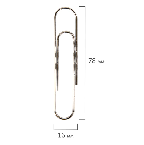 Большие скрепки изготовлены из стали, имеют классическую овальную форму и блестящее никелевое покрытие. Длина скрепки составляет 78 мм. Не окисляются и не повреждают документы. 50 штук в картонной коробке.