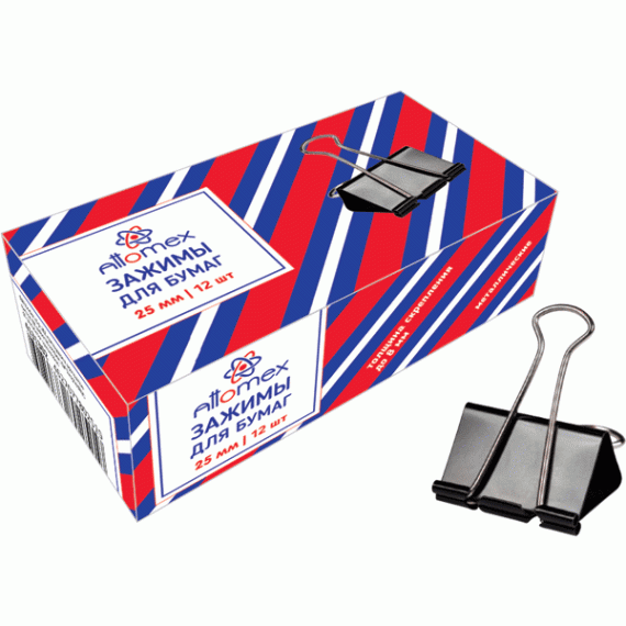 Зажим для бумаг "Attomex" металлический (25 мм) толщина скрепления до 10,5 мм, черный, 12 шт в карто