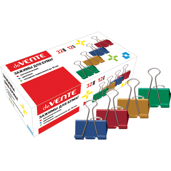 Зажим для бумаг "deVENTE" металлический (32 мм) толщина скрепления до 13,5 мм, цветной ассорти, 12 шт в картонной коробке