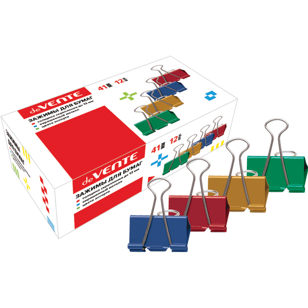Зажим для бумаг "deVENTE" металлический (41 мм) толщина скрепления до 17 мм, цветной ассорти, 12 шт в картонной коробке