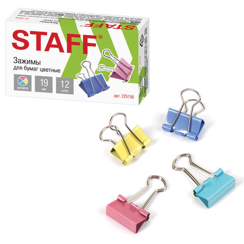 Зажимы для бумаг 19 мм,STAFF "Profit", КОМПЛЕКТ 12 шт., на 60 листов, цветные, картонная коробка