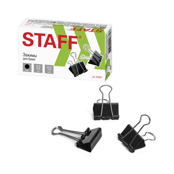 Зажимы для бумаг 32 мм, STAFF "EVERYDAY", КОМПЛЕКТ 12 шт., на 140 листов, черные, картонная коробк