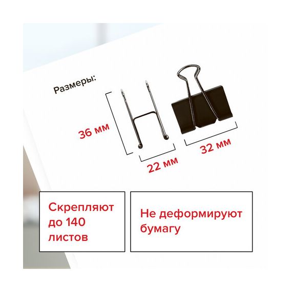 Изготовлены из стали с черным покрытием. Позволяют скреплять до 140 листов. Не деформируют бумагу. Ширина зажима - 32 мм. Поставляются по 12 штук в картонной коробке.