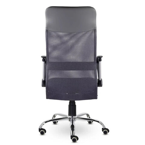 Широкая эргономичная спинка обтянута прочной сеткой, а подголовник – искусственной кожей.