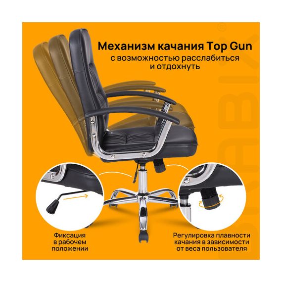 Надежный механизм качания "Top Gun" позволяет осуществлять свободное качание с фиксацией в рабочем положении и регулировки наклона под вес сидящего. Он помогает менять положение сидящего, чем снижает утомляемость в течение рабочего дня.
