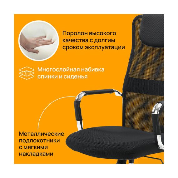 Высокая сетчатая спинка с интегрированным подголовником, выраженная поддержка поясницы и подлокотники с противоскользящими накладками гарантируют комфортное долгосрочное использование.