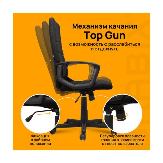 Надежный механизм качания "Top Gun" гарантирует хорошую поддержку спины и поясницы за счет возможности свободного качания с фиксацией в одном рабочем положении и регулировку угла наклона под вес сидящего.