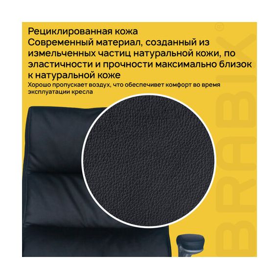 Обивка кресла выполнена из рециклированной кожи - современного материала, созданного из измельченных частиц натуральной кожи. По эластичности и прочности рециклированная кожа максимально близка к натуральной, а также имеет запах выделанной кожи. Материал хорошо пропускает воздух, что положительным образом сказывается на комфорте во время эксплуатации. Рециклированная кожа износоустойчива, кресло способно сохранять привлекательный внешний вид длительное время.