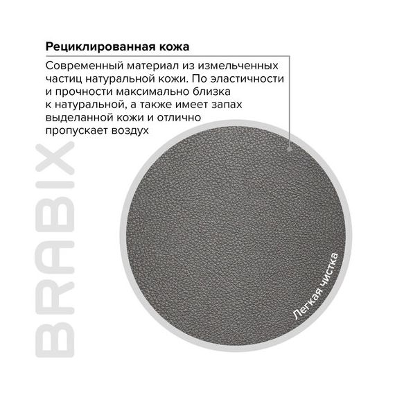 Обивка выполнена из высокотехнологичного, современного материала - рециклированной кожи. По эластичности и прочности рециклированная кожа максимально близка к натуральной, а также имеет запах выделанной кожи. Этот материал устойчив к истиранию, что позволит сохранить внешний вид кресла на протяжении всего срока эксплуатации.