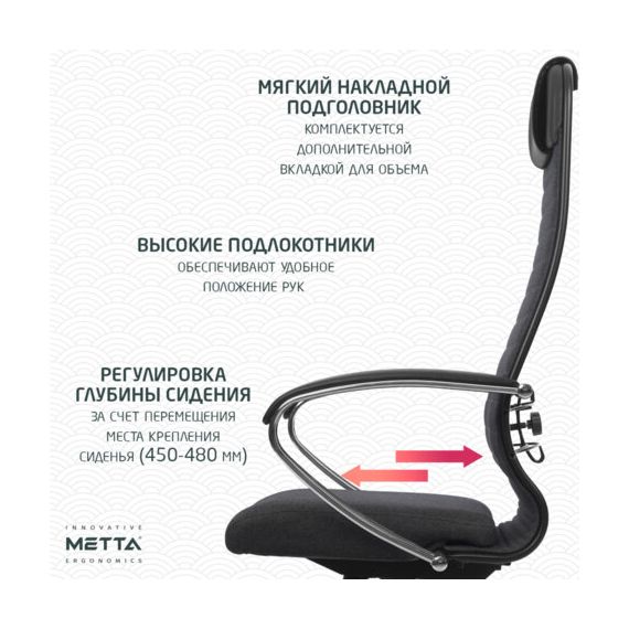 Спинка мягкая высокая, эргономичной формы с ярко выраженной поясничной поддержкой. Эргогиб, как у кресел SAMURAI.