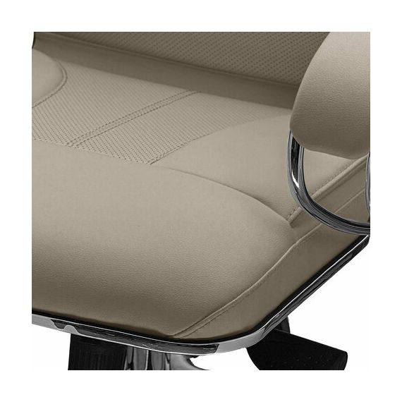 Обивка из износостойкой перфорированной рециклированной кожи на рабочих поверхностях кресла и экокожа на нерабочих поверхностях.
