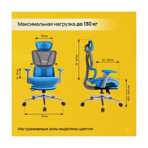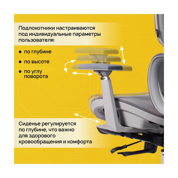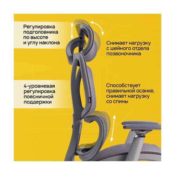 Эргономичный дизайн разработан с заботой о вашем здоровье. Регулируемые подголовник и поясничная поддержка обеспечат оптимальное положение корпуса, способствуя снижению напряжения в области шеи и спины.