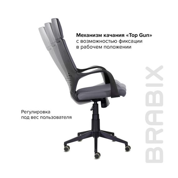 Надежный механизм "Top Gun" гарантирует хорошую поддержку спины и комфорт за счет возможности свободного качания с фиксацией в одном рабочем положении и регулировкой усилия качания под вес сидящего, позволяет регулировать высоту сиденья.