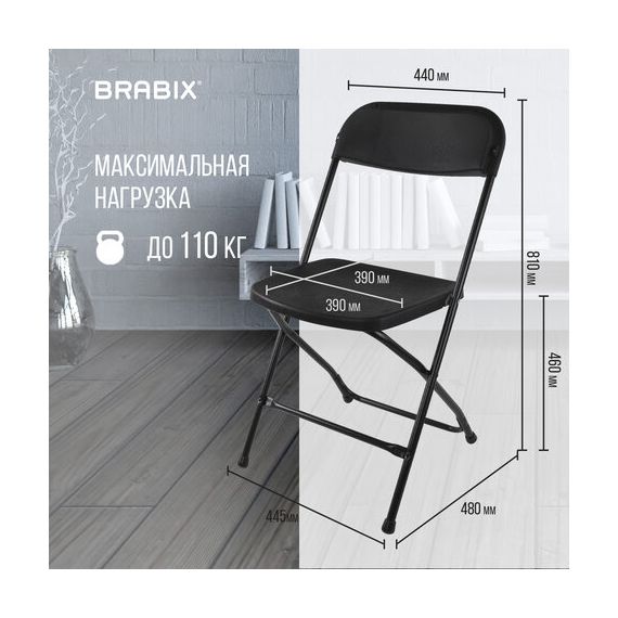 Прочная металлическая рама толщиной 1,2 мм обеспечивает долговечность эксплуатации, а пластиковые насадки на ножках защищают напольное покрытие от повреждений. Модель оснащена пластиковой спинкой с эргономичным профилем. Складная конструкция экономит место при перевозке и хранении. Стул выдерживает нагрузку до 110 кг. Для дополнительной сохранности комплект упакован в картонную коробку.