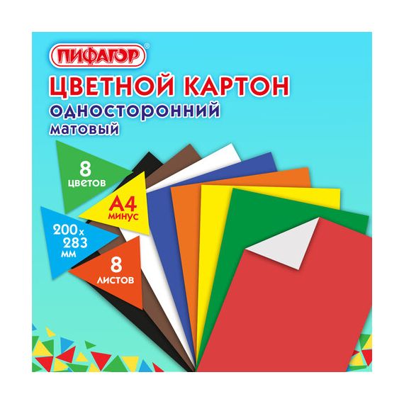 Картон цветной А4 немелованный (матовый), 8 листов 8 цветов, ПИФАГОР, 200х283 мм