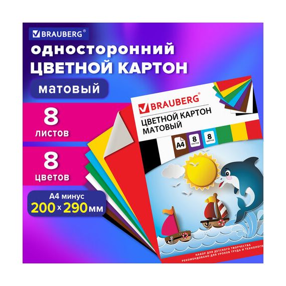 Картон цветной А4 немелованный (матовый), 8 листов 8 цветов, в папке, BRAUBERG, 200х290 мм, "Дельфин