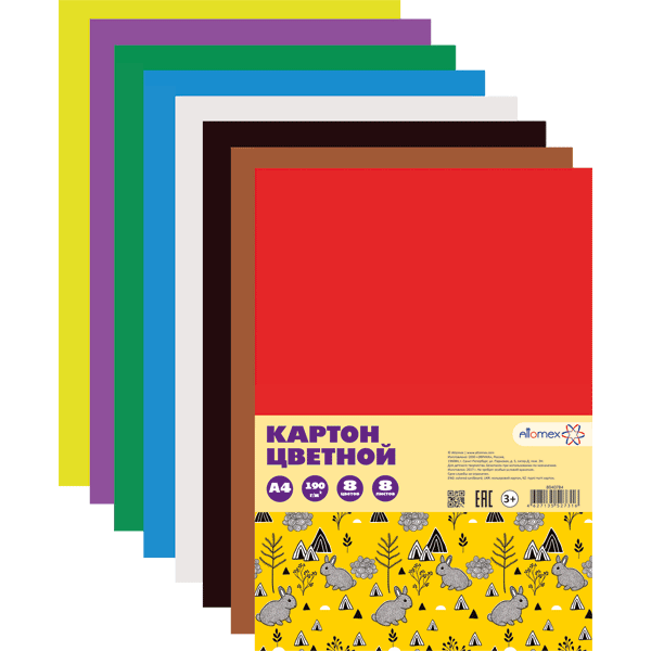Картон цветной "Attomex. Rabbits" A4 (203x283 мм) немелованный 190 г/м², 8 цв, 8 л, в пластиковом пакете