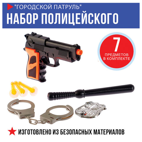 Комплектация: пистолет, дубинка, наручники, значок, "пули" (в комплекте 3 шт.)