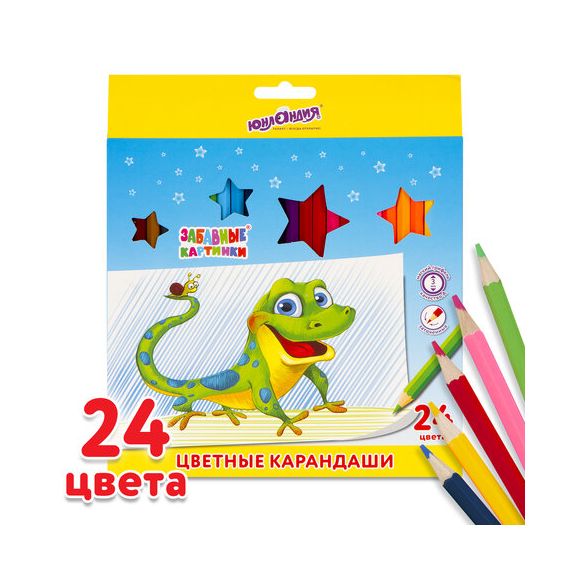 Карандаши цветные мягкие ЮНЛАНДИЯ "ЗАБАВНЫЕ КАРТИНКИ", 24 цвета, классические, заточенные