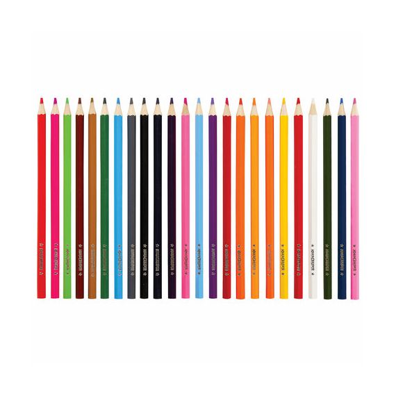 Набор состоит из 24 цветов: черный, белый, серый, темно-коричневый, коричневый, светло-коричневый, бежевый, фиолетовый, темно-фиолетовый, красный, фуксия, розовый, персиковый, темно-зеленый, зеленый, салатовый, сине-зеленый, темно-синий, синий, голубой, темно-оранжевый, оранжевый, светло-оранжевый, желтый. Яркие цвета развивают цветовосприятие ребенка. Шестигранная форма сечения корпуса позволяет не скатываться карандашам с поверхности стола во время занятий рисованием. Они изготовлены из древесины ценных пород и имеют лакированный корпус. Высокосортная древесина и качество исполнения гарантируют легкую заточку. Мягкий грифель качества "А" с диаметром 3 мм обладает повышенной прочностью, не ломается и не крошится при заточке. Все карандаши заточены и поставляются в картонной упаковке с европодвесом.