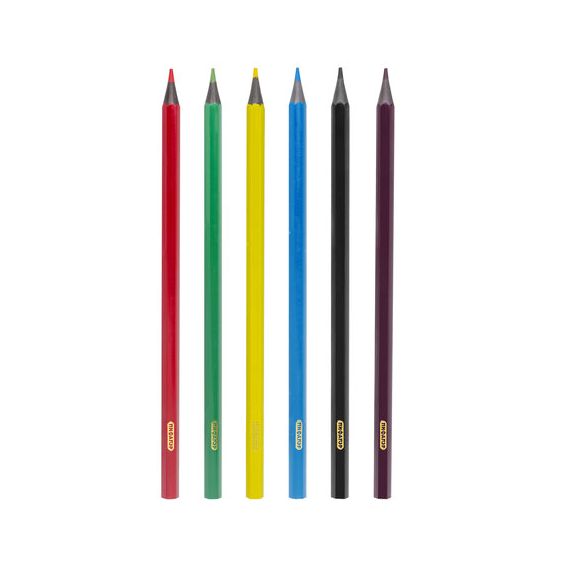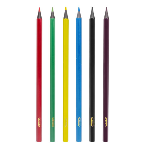 Набор состоит из 6 цветов: красный, желтый, зеленый, голубой, коричневый, черный. Шестигранная форма сечения корпуса позволяет карандашу не скатываться с поверхности стола во время занятий рисованием. Карандаши изготовлены из переработанного пластика и имеют лакированный корпус, который при разломе не образует острые края и безопасен для детей. Легко затачиваются. Грифель диаметром 2,65 мм обладает повышенной прочностью. Все карандаши заточены и поставляются в картонной упаковке с европодвесом.