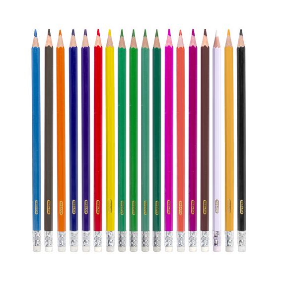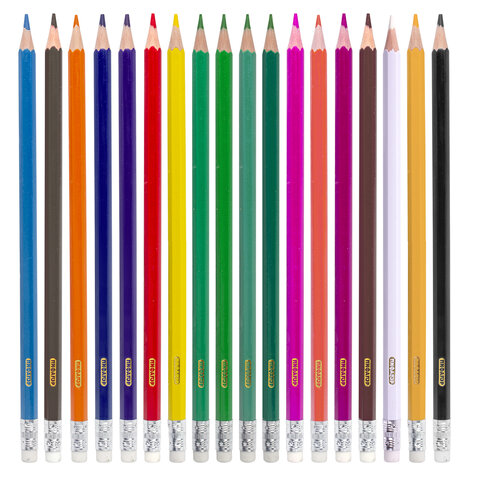 Набор состоит из 18 цветов: белый, красный, алый, розовый, пурпурный, желтый, канареечный, оранжевый, персиковый, салатовый, зеленый, темно-зеленый, голубой, синий, фиолетовый, коричневый, серый, черный. Шестигранная форма сечения корпуса позволяет карандашу не скатываться с поверхности стола во время занятий рисованием. Карандаши изготовлены из пластика и имеют лакированный корпус, который при разломе не образует острые края и безопасен для детей. Легко затачиваются. Особый грифель диаметром 3 мм обладает повышенной прочностью и легко стирается обычным ластиком. Все карандаши заточены, оснащены ластиком и поставляются в картонной упаковке с европодвесом.