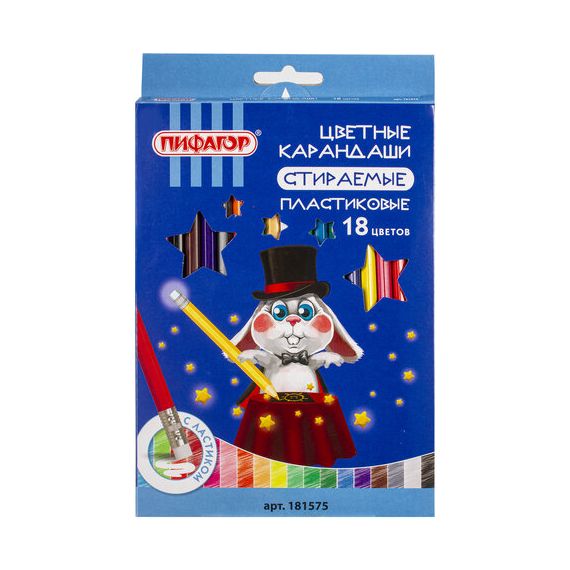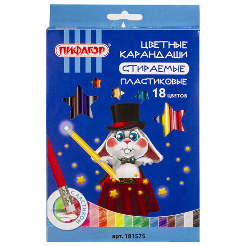 Карандаши цветные стираемые с ластиком ПИФАГОР "МАГИЯ", 18 цветов, пластиковые