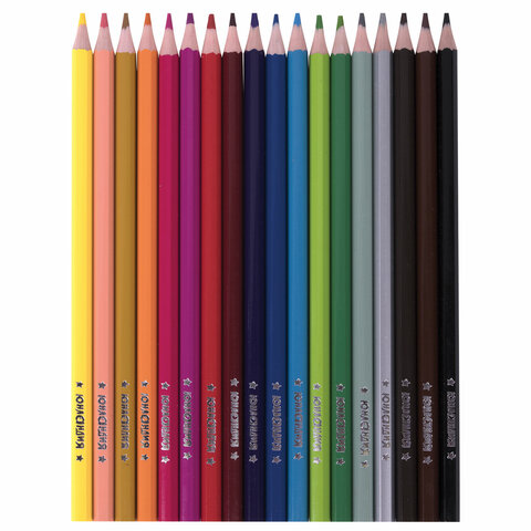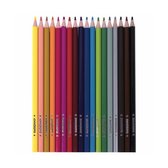 Набор состоит из 18 цветов: черный, темно-синий, синий, голубой, салатовый, зеленый, темно-зеленый, желтый, оранжевый, фуксия, розовый, красный, бордовый, серый, светло-серый, фиолетовый, темно-коричневый, коричневый. Шестигранная форма сечения корпуса позволяет не скатываться карандашу с поверхности стола во время занятий рисованием. Карандаши изготовлены из высококачественного пластика и имеют лакированный корпус. Качество исполнения гарантирует легкую заточку. Грифель диаметром 3 мм обладает повышенной прочностью. Все карандаши заточены и поставляются в картонной упаковке с европодвесом.