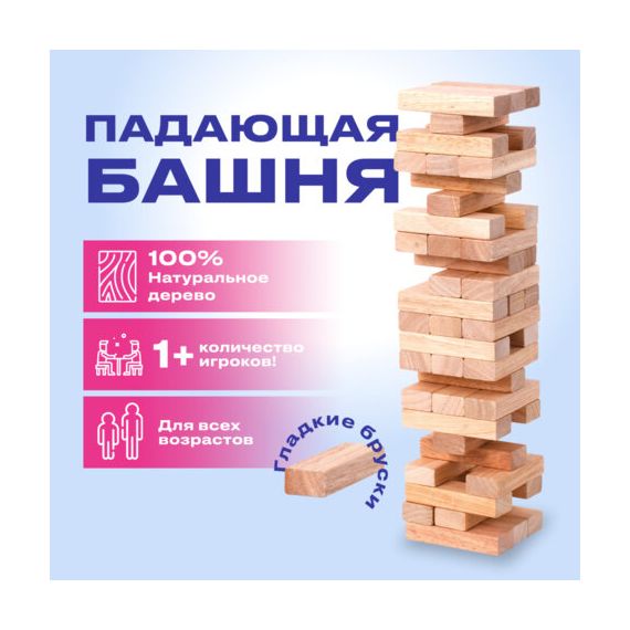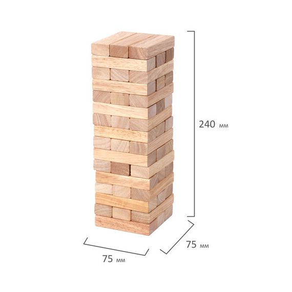 Настольная игра включает в себя 48 деревянных неокрашенных брусков размером 75х25х15 мм. Бруски гладкие и ровные, со скруглёнными углами.