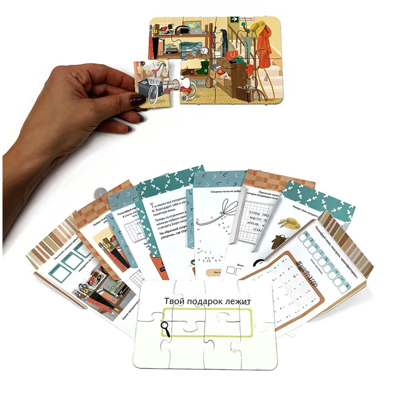 • Тематический пазл из 8 элементов, с обратной стороны которого нужно вписать то заветное место, где спрятан подарок.