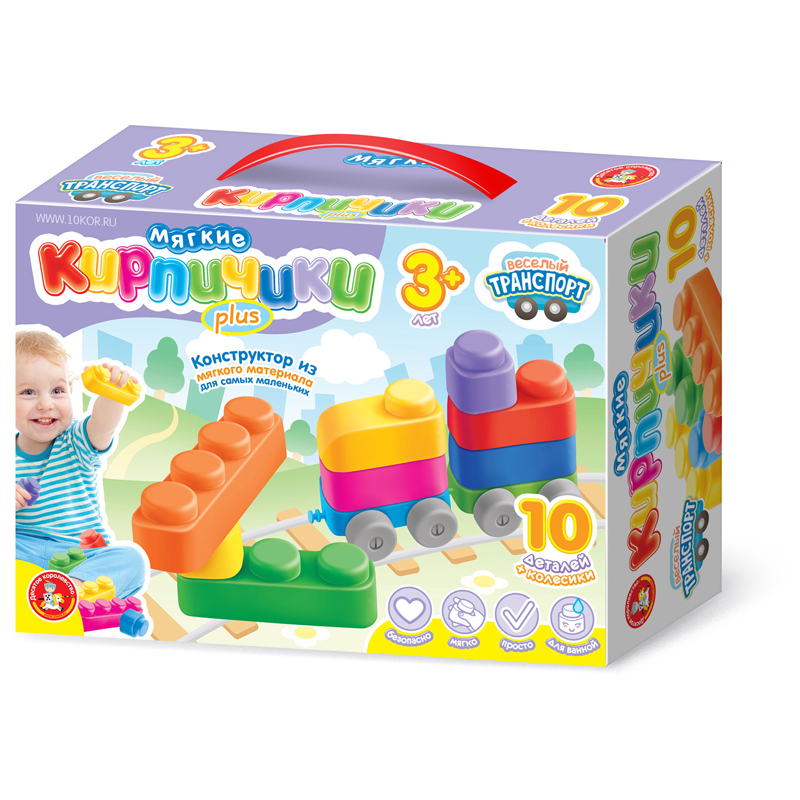Конструктор Десятое королевство "Мягкие кирпичики plus. Веселый транспорт", 10 деталей + колесики, к