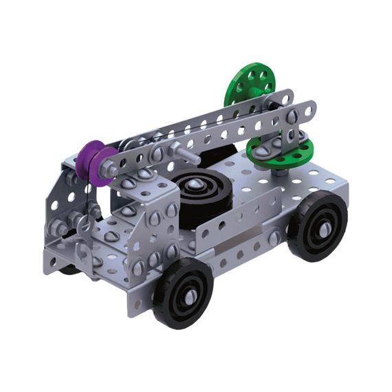 В набор входит 146 элементов, уровень сложности сборки - начальный. В комплектацию входит инструкция, в которой описан пошаговый алгоритм создания 5 моделей (подъемный кран, коляска, самолет, 2 вида автомобилей). Освоив азы работы с гайками, винтами, отверткой и гаечным ключом, можно смело приступать к созданию собственных схем сборки. Простор для фантазии безграничен: можно конструировать транспортные средства, всевозможные промышленные машины, мебель и т.д.