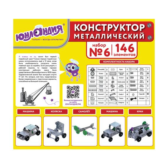 Металлический конструктор ЮНЛАНДИЯ предназначен для ознакомления с азами конструирования, помогает в развитии мелкой моторики, абстрактного и логического мышления. Отлично подходит для школьных уроков труда.