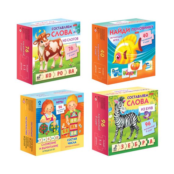 Обучающая игра для детей HATBER создана по принципу пазла. Эта красочная увлекательная игра поможет ребенку быстро и легко научиться составлять слова из букв и слогов, складывать и вычитать в пределах 20, находить состав числа.