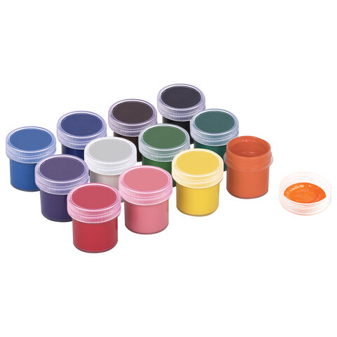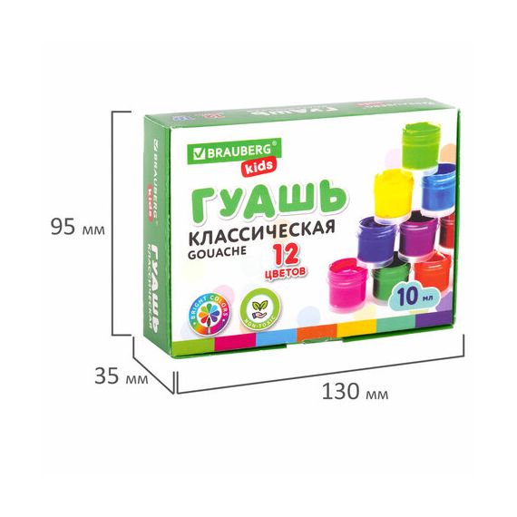 Краски полностью безопасны в использовании, нетоксичны, без резкого запаха. Гуашь обладает высокой светостойкостью и укрывистостью, легко cмешивается и размывается водой, хорошо наносится, без труда удаляется с рук и одежды. Краски разлиты в пластмассовые герметичные баночки объемом 10 мл. Общий объем – 120 мл.