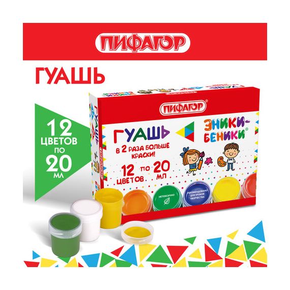 Гуашь ПИФАГОР отлично подойдет для школьников младших и средних классов, начинающих свой творческий путь на уроках рисования. Хорошо наносится на бумагу, картон, дерево, стекло, керамику.