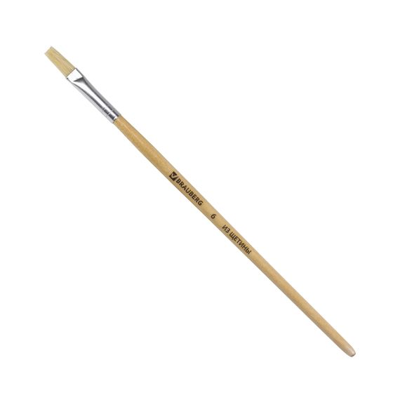 Кисть из щетины обладает высокой упругостью, хорошо держит форму, долговечна и надежна. Кисть № 6 позволит прорисовывать детали и наносить крупные мазки и линии. Деревянную лакированную рукоятку кисти удобно держать в руке.